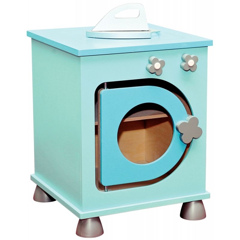 Bloc lingerie en bois bleu . La structure comprend 1 lave-linge, 1 table à repasser avec son fer et des gros boutons en forme de fleurs. Dès 10 mois.