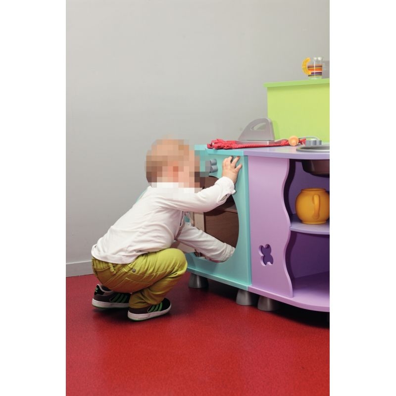 La structure comprend 1 lave-linge, 1 table à repasser avec son fer et des gros boutons en forme de fleurs. La porte du lave-linge est anti pince doigts.